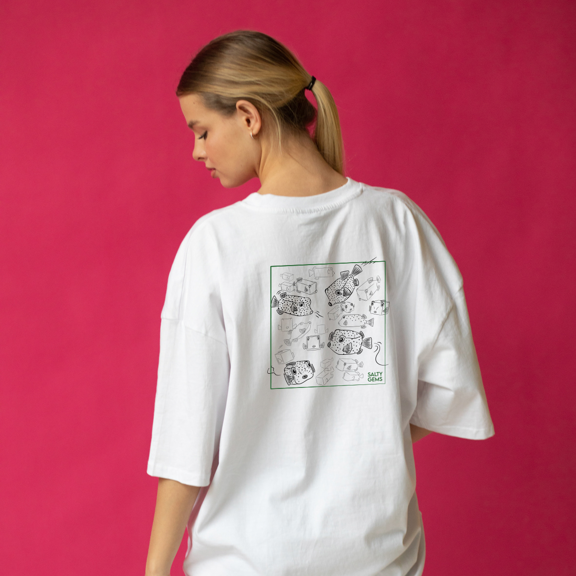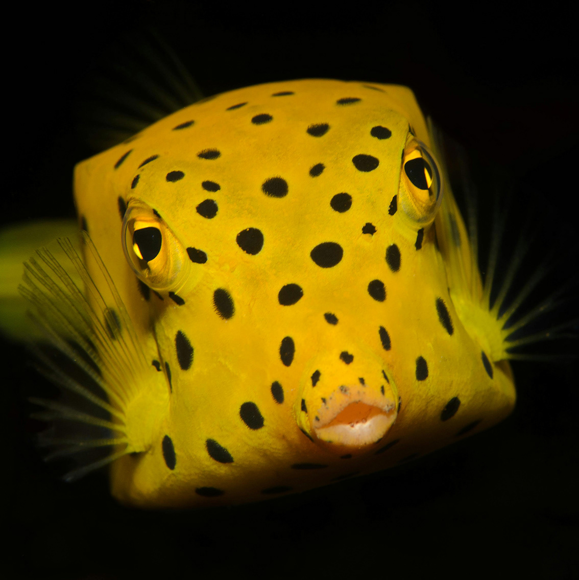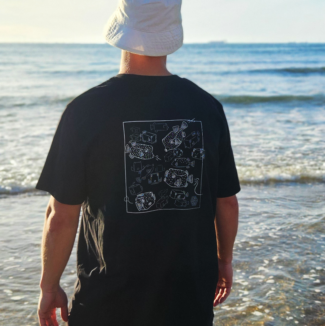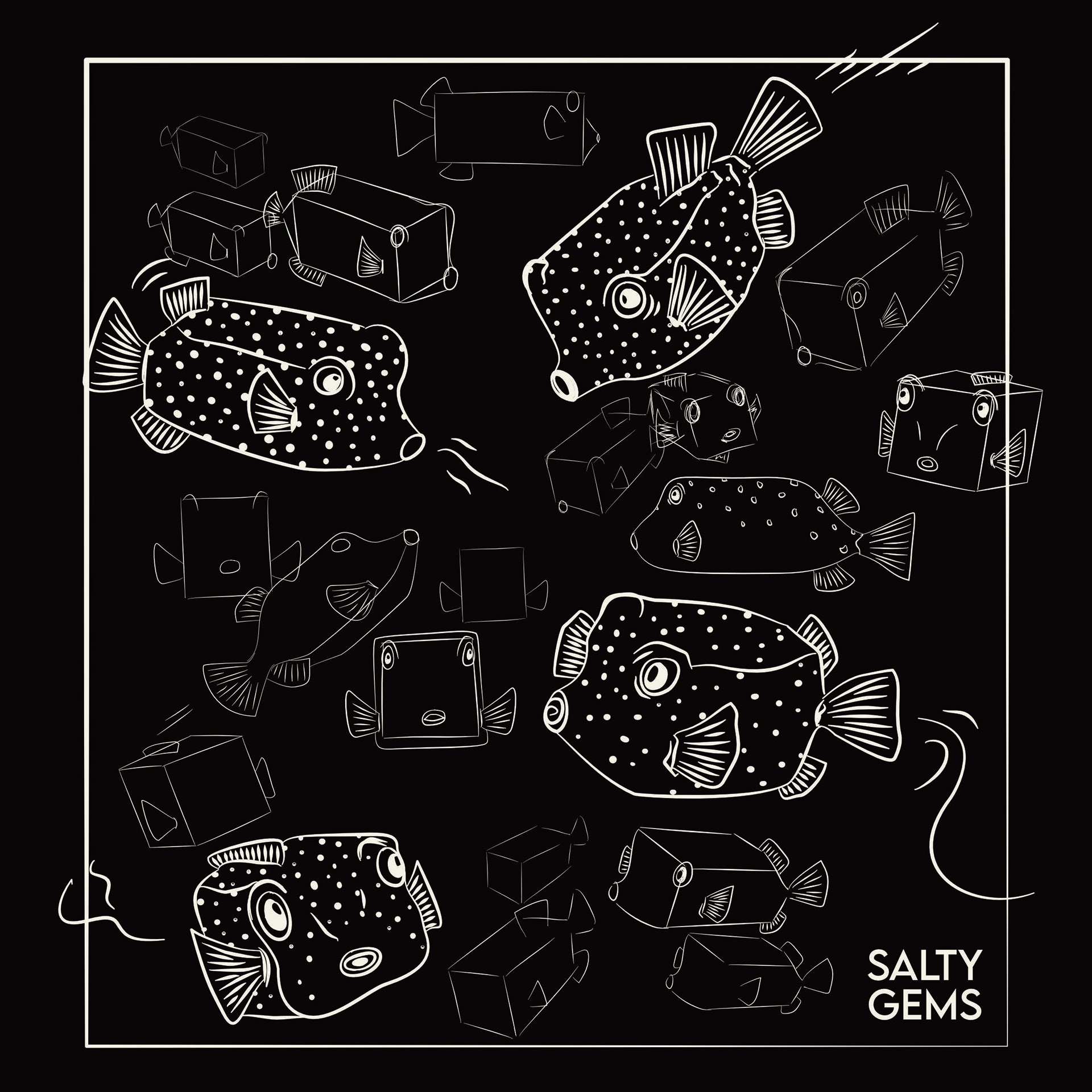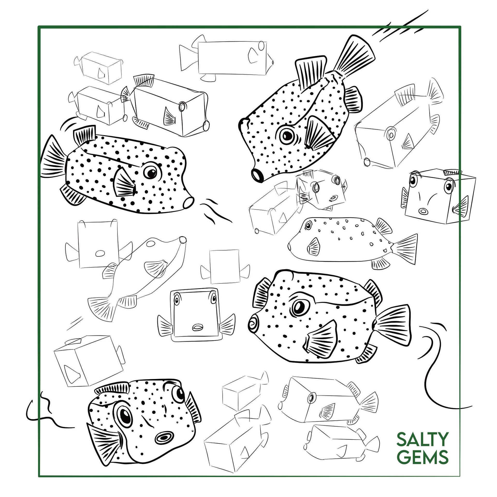 De sketchy print is geïnspireerd op deze hoekige, levendige vissen.