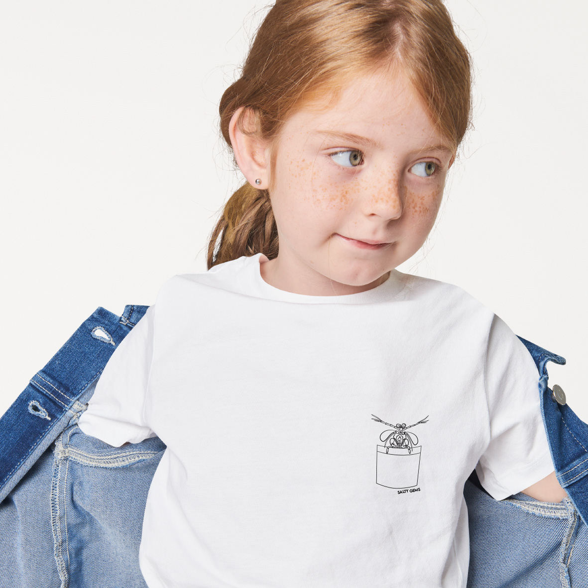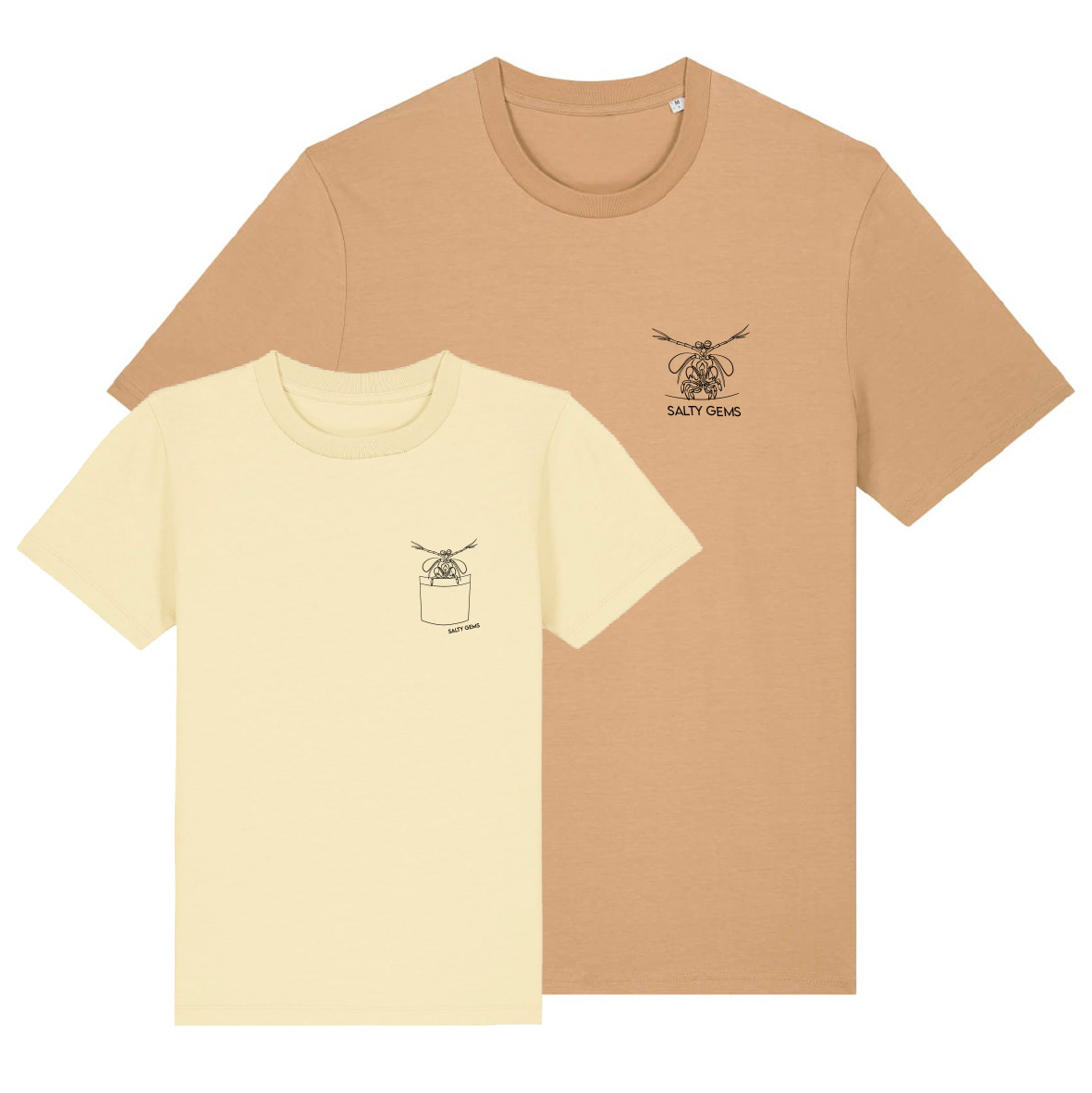 Wil jij een handgetekende Mantis Shrimp op je shirt? Of, speciaal voor kids, in je borstzakje?