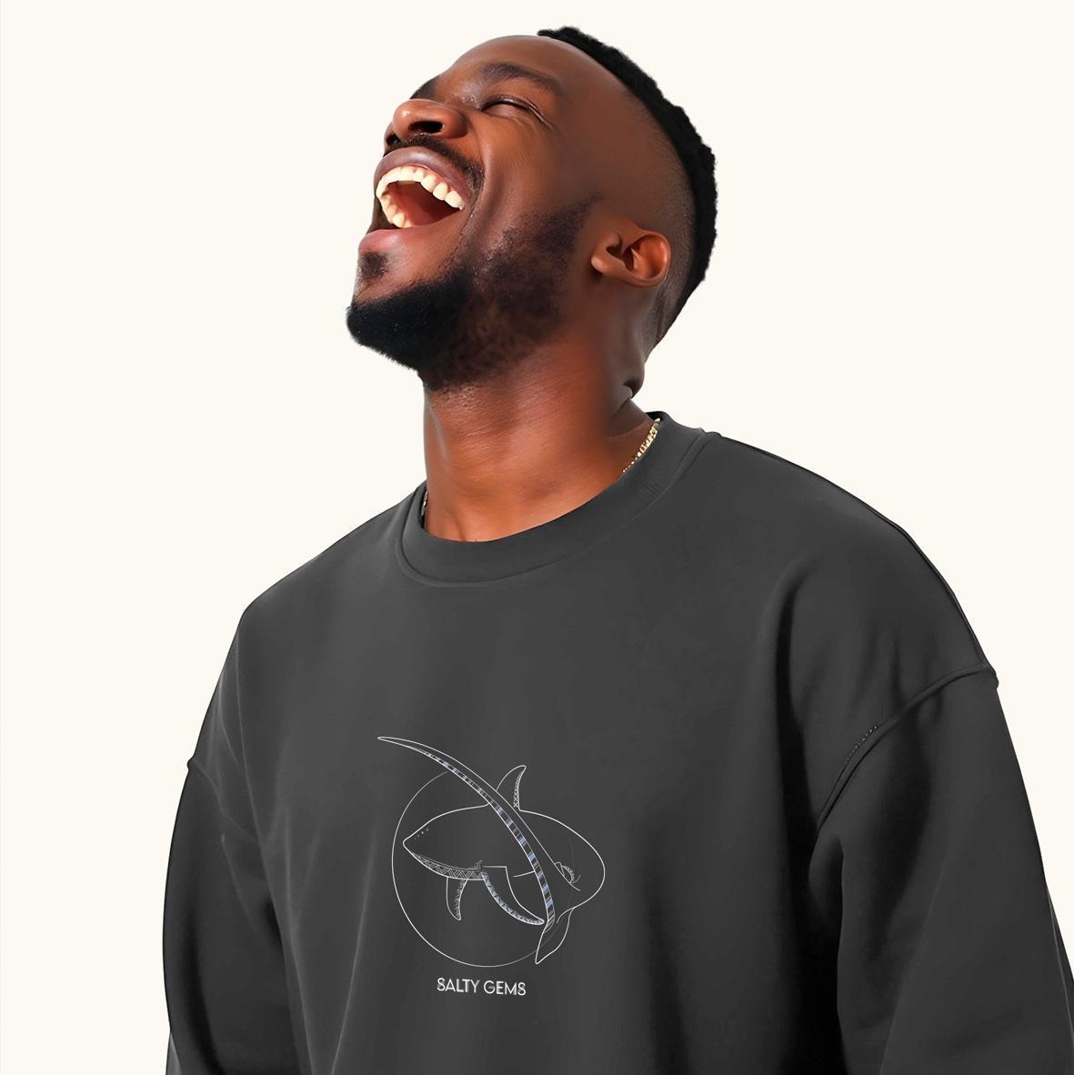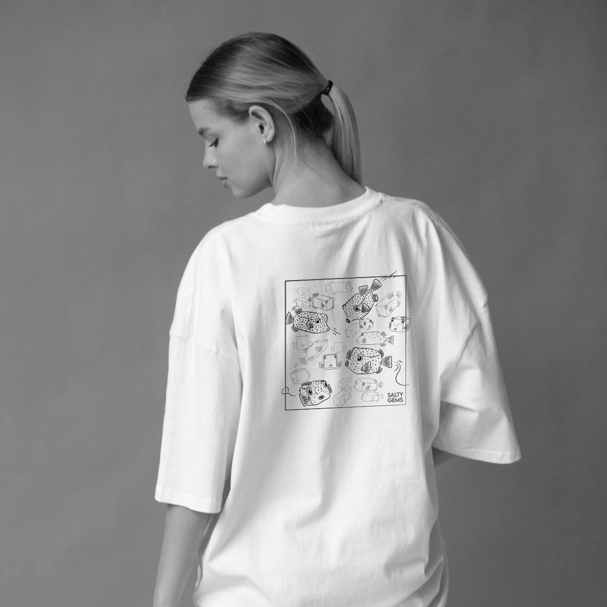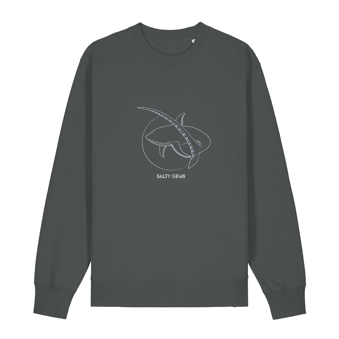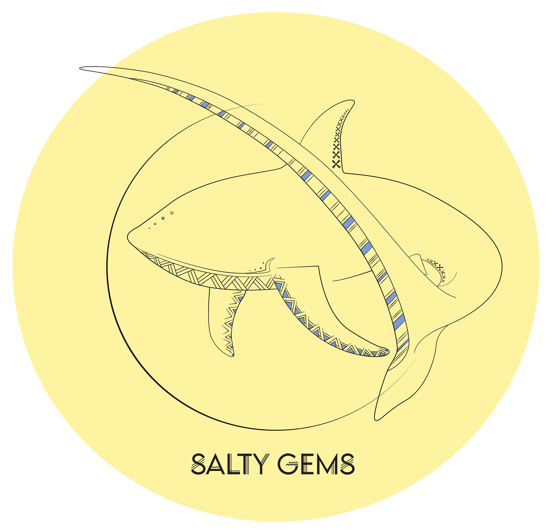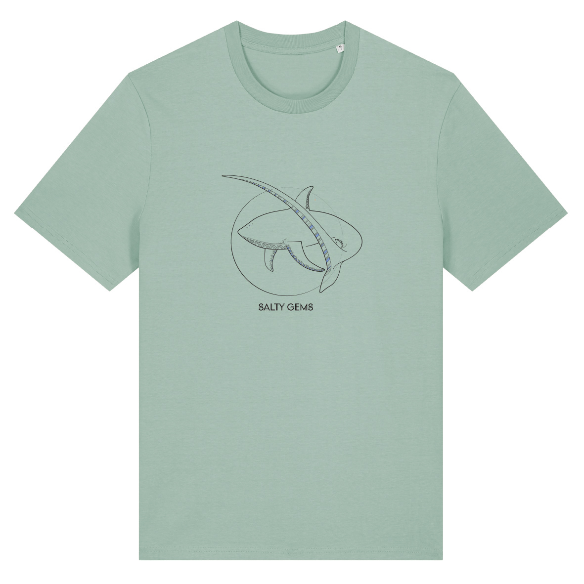 Deze gedetailleerde print is gebaseerd op de voshaai en zijn prachtige staart.